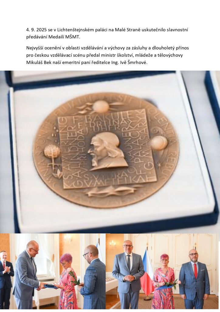 Nejvyšší ocenění v oblasti vzdělávání a výchovy za zásluhy a dlouholetý přínos pro českou vzdělávací scénu předal ministr školství, mládeže a tělovýchovy Mikuláš Bek naší emeritní paní ředitelce Ing. Ivě Šmrhové.